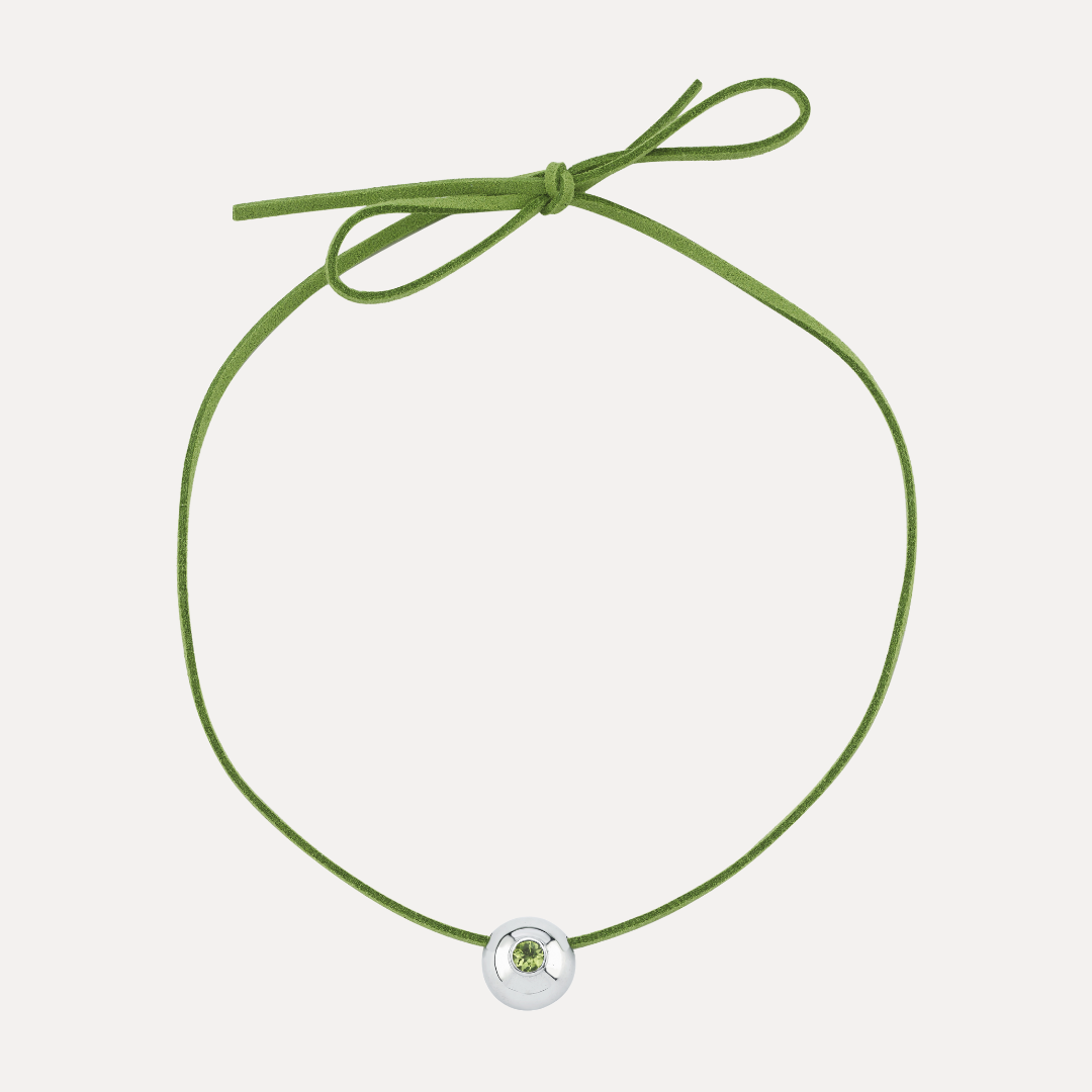 The Bubble Choker from BOULO is a playful yet sophisticated piece, featuring a polished silver pendant with a vibrant peridot gemstone at its center. Suspended on a soft green strap, this choker offers both comfort and style. Its minimalist design and refreshing pop of color make it the perfect accessory for adding uniqueness to any look.