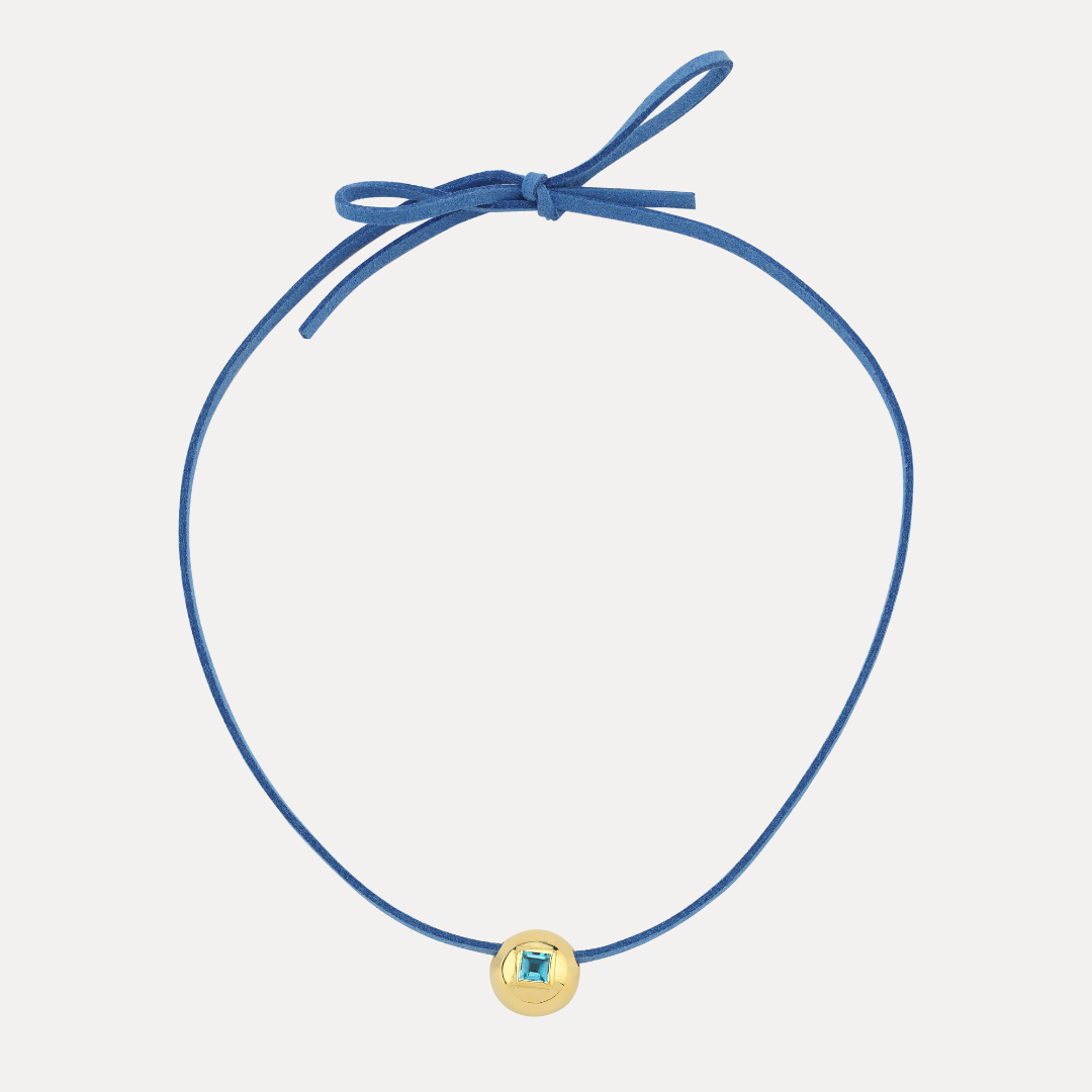 The Bubble Choker combines timeless elegance with a playful pop of color. Featuring a smooth gold pendant set with a sparkling Swiss topaz gemstone, this choker is suspended on a soft blue strap, creating a striking contrast. Its minimalist design and vibrant color make it the perfect accessory for adding a chic touch to any outfit.