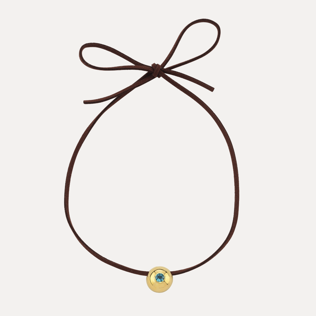 The Bubble Choker combines modern design with a touch of elegance. Featuring a smooth gold pendant set with a stunning Swiss topaz gemstone, this choker is suspended on a soft brown strap, allowing for a comfortable and adjustable fit. The minimalist yet sophisticated design makes it a versatile piece, perfect for adding a pop of color and style to both casual and formal outfits.