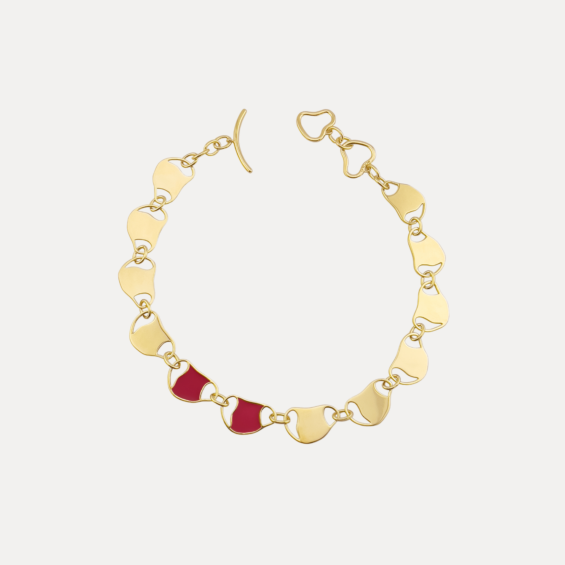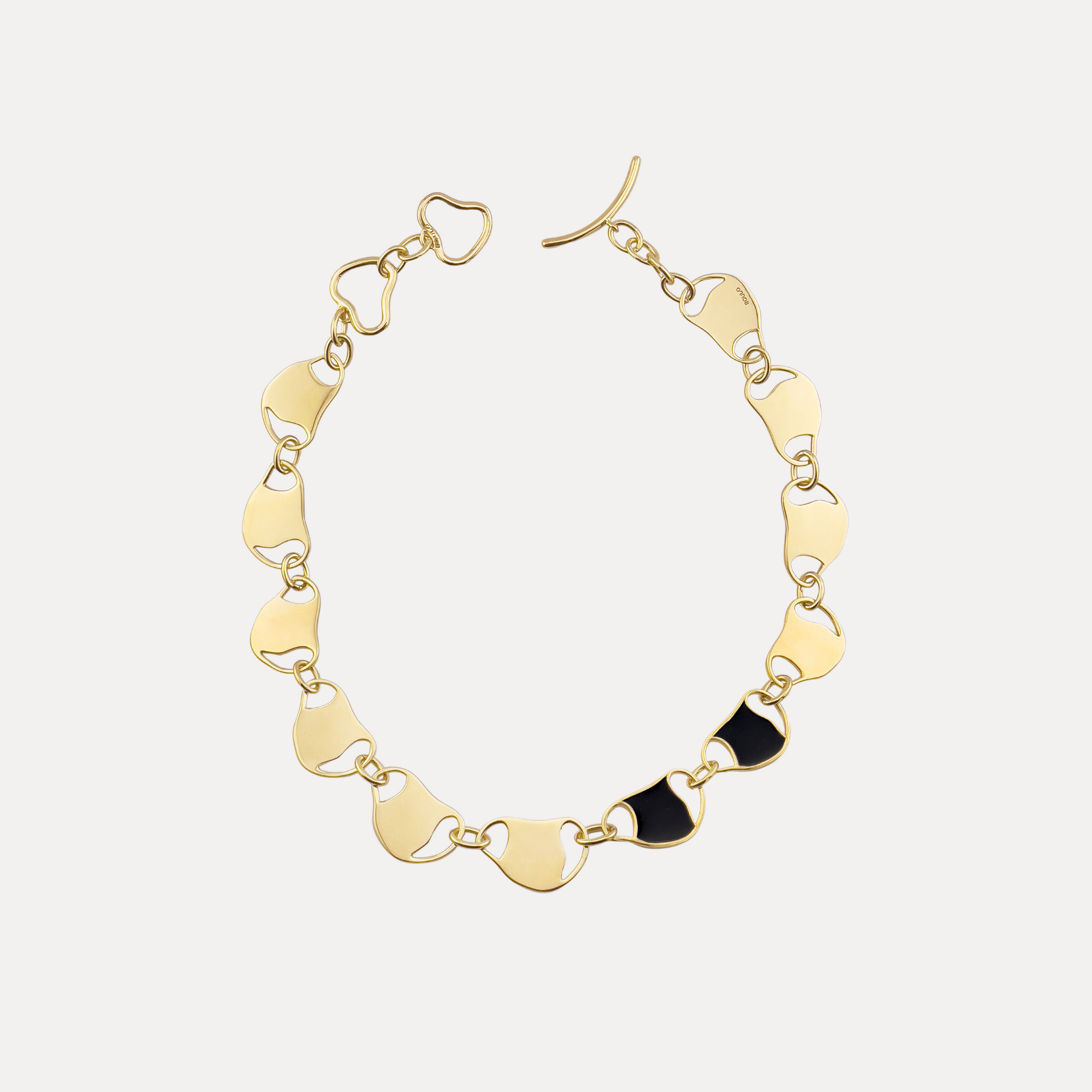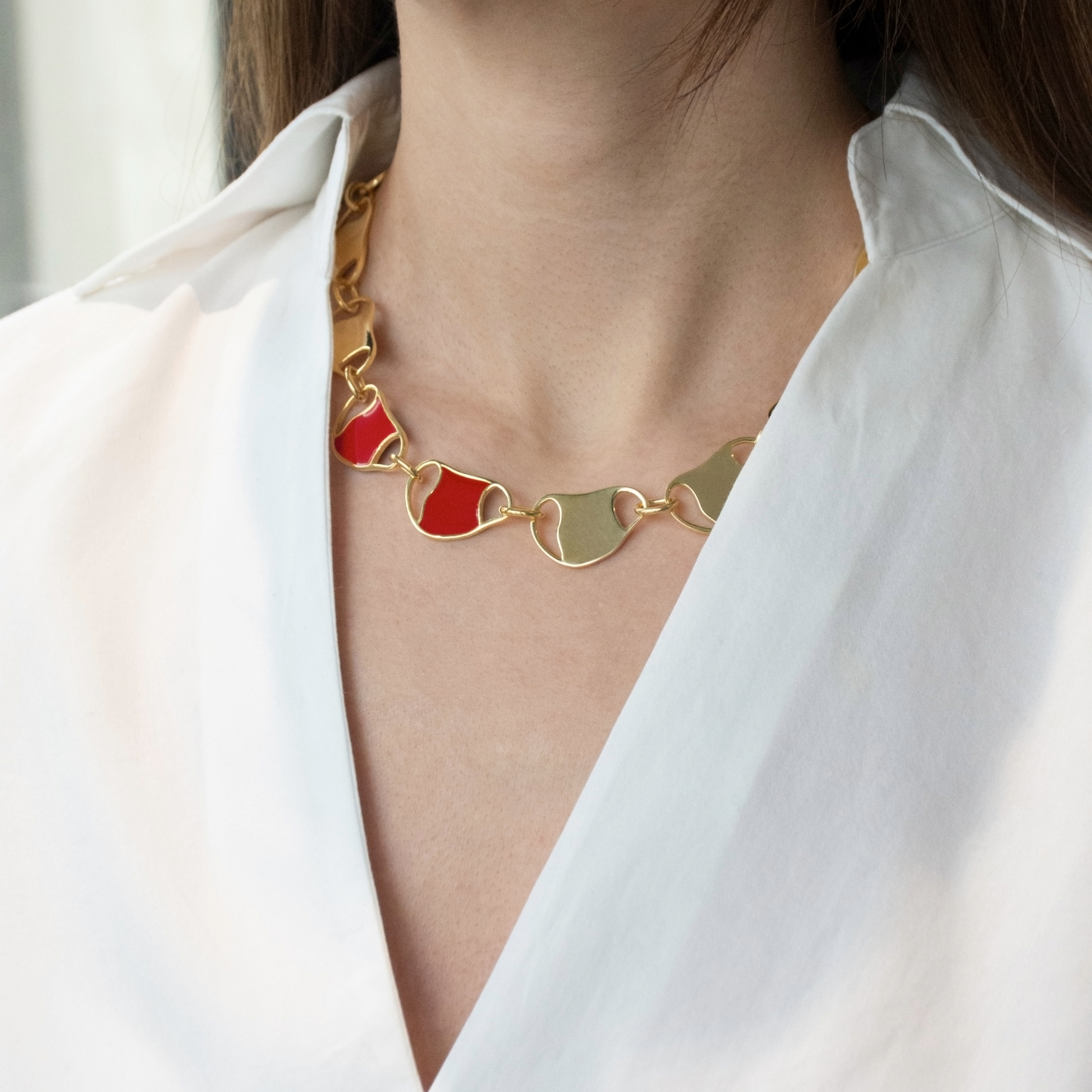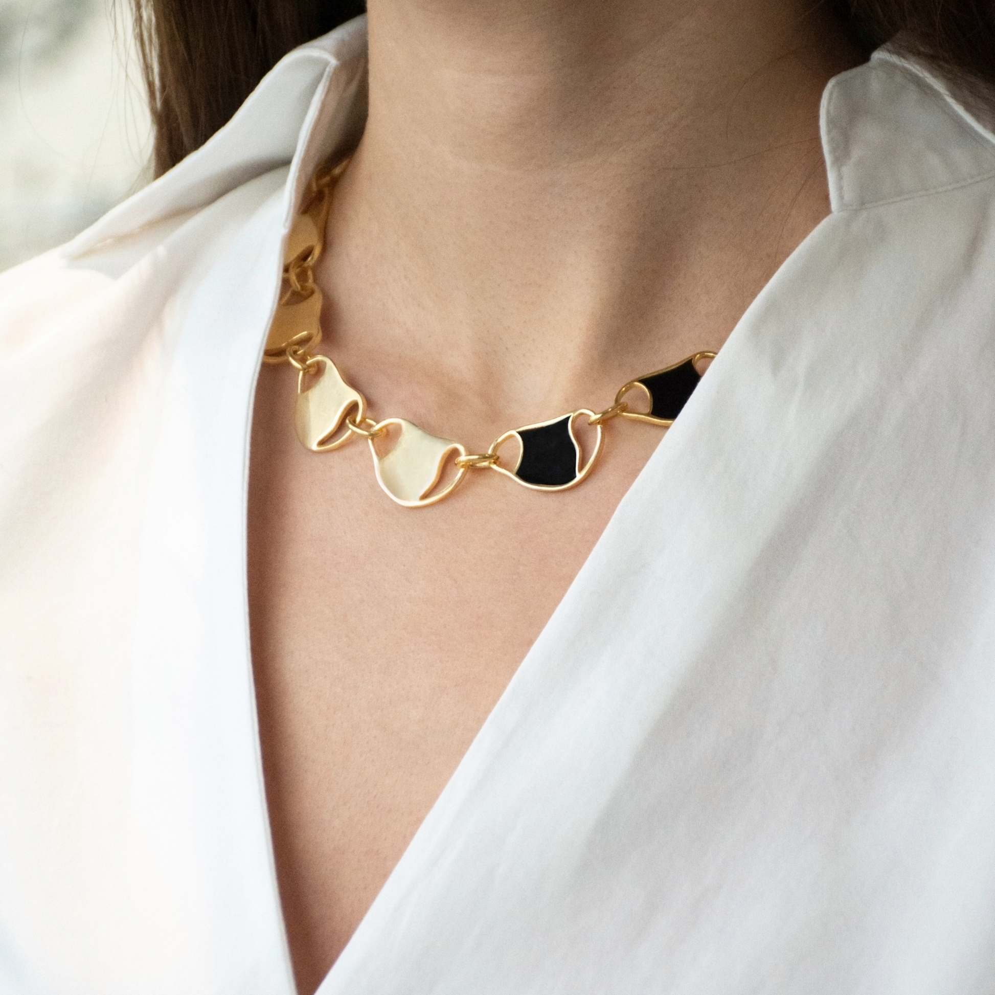 The Camille Duo Necklace exudes elegance with its distinctive design. Featuring a sleek black on one side and a striking red on the other, complemented by accents in polished gold, this necklace offers versatility for any occasion. Its unique shape and striking contrast of colours, enhanced by the gold elements, add depth and sophistication, making it a timeless accessory for effortless glamour.