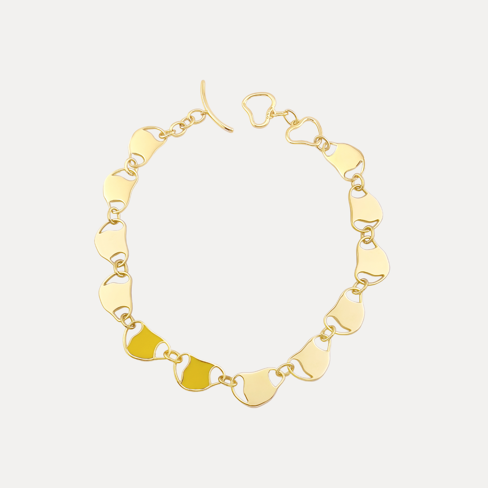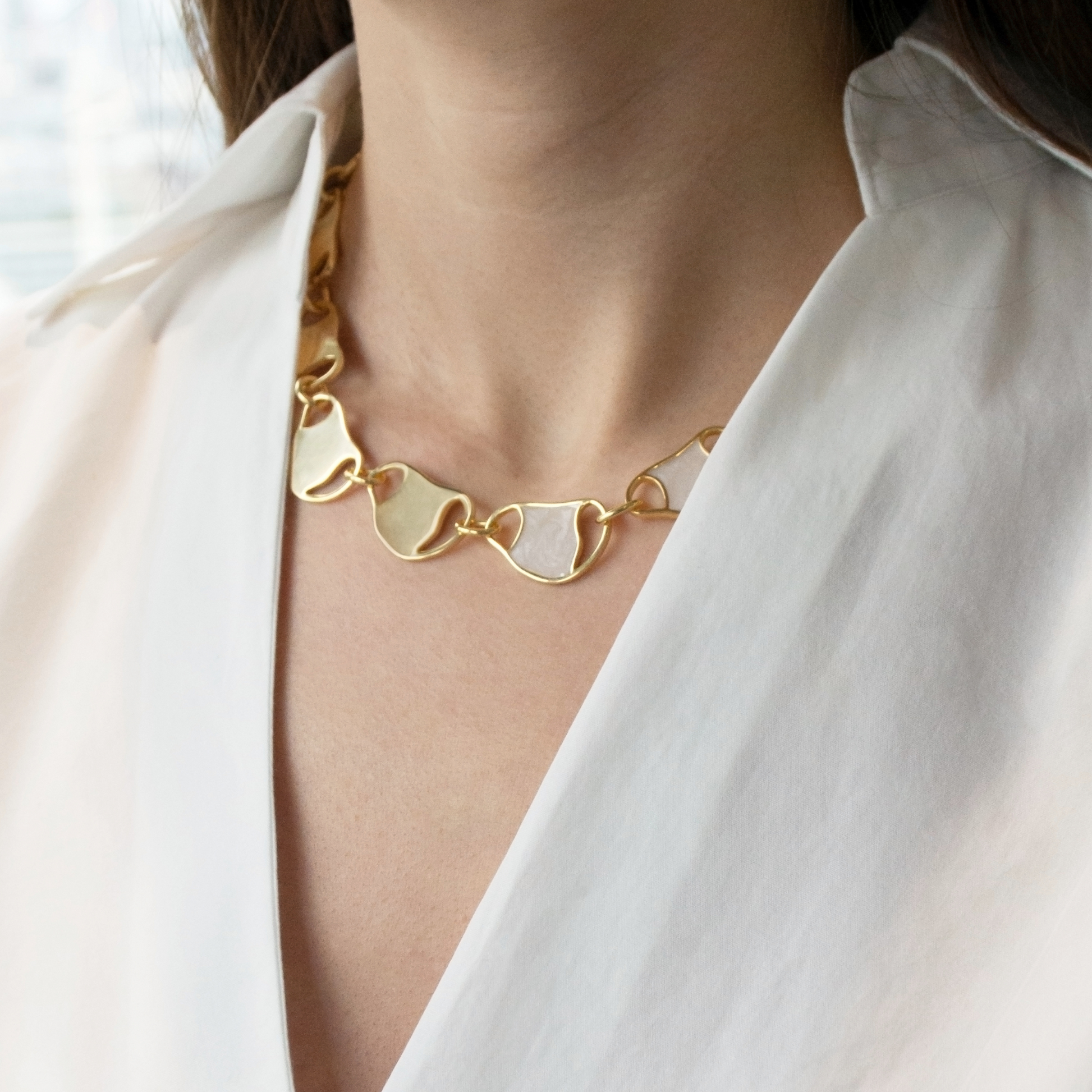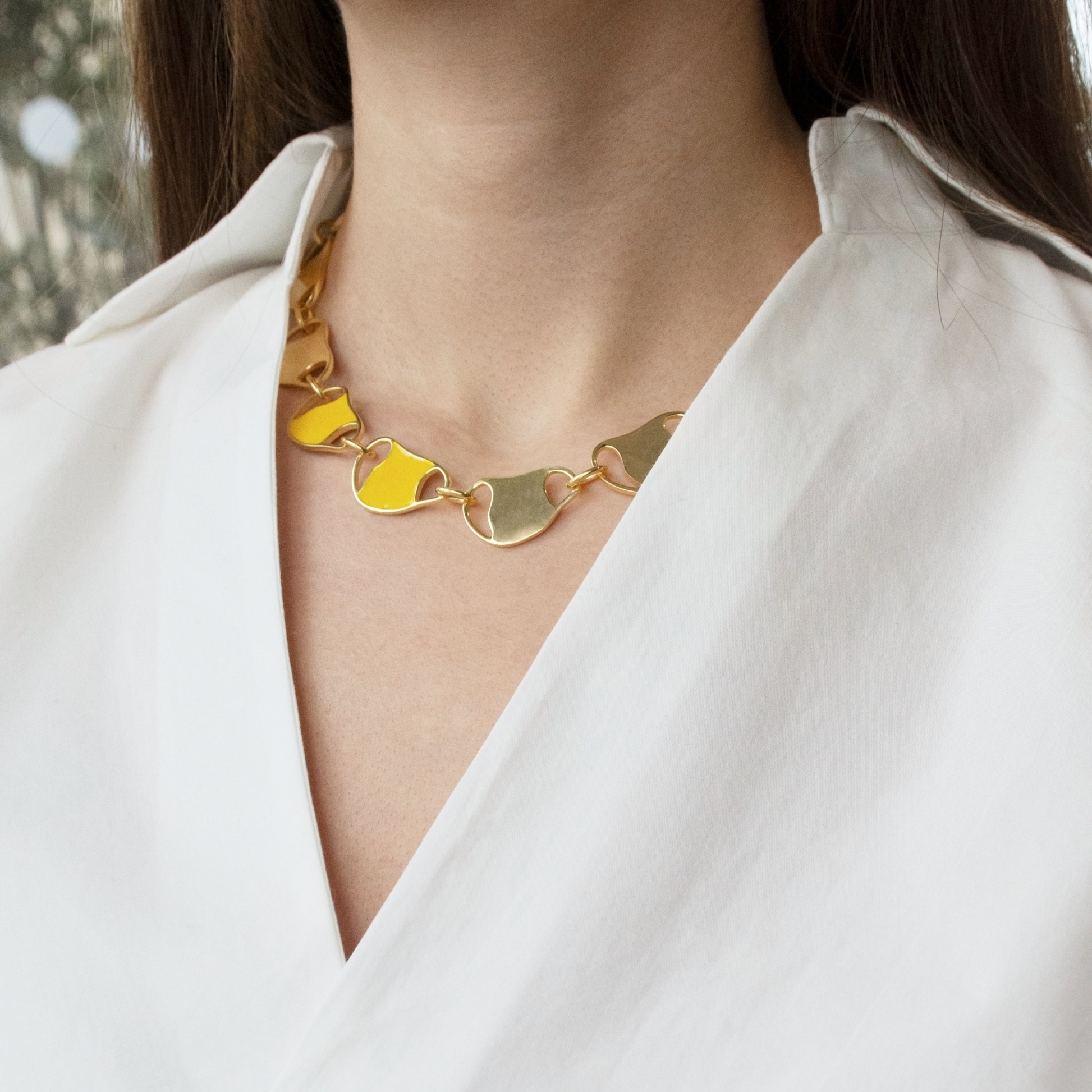 Camille Duo Necklace radiates elegance with its distinctive design. Featuring lustrous mother-of-pearl white on one side and vibrant yellow on the other, complemented by accents in polished gold, this necklace offers versatility for any occasion. Its unique shape and contrasting colors add depth and sophistication, making it a timeless accessory for effortless glamour.