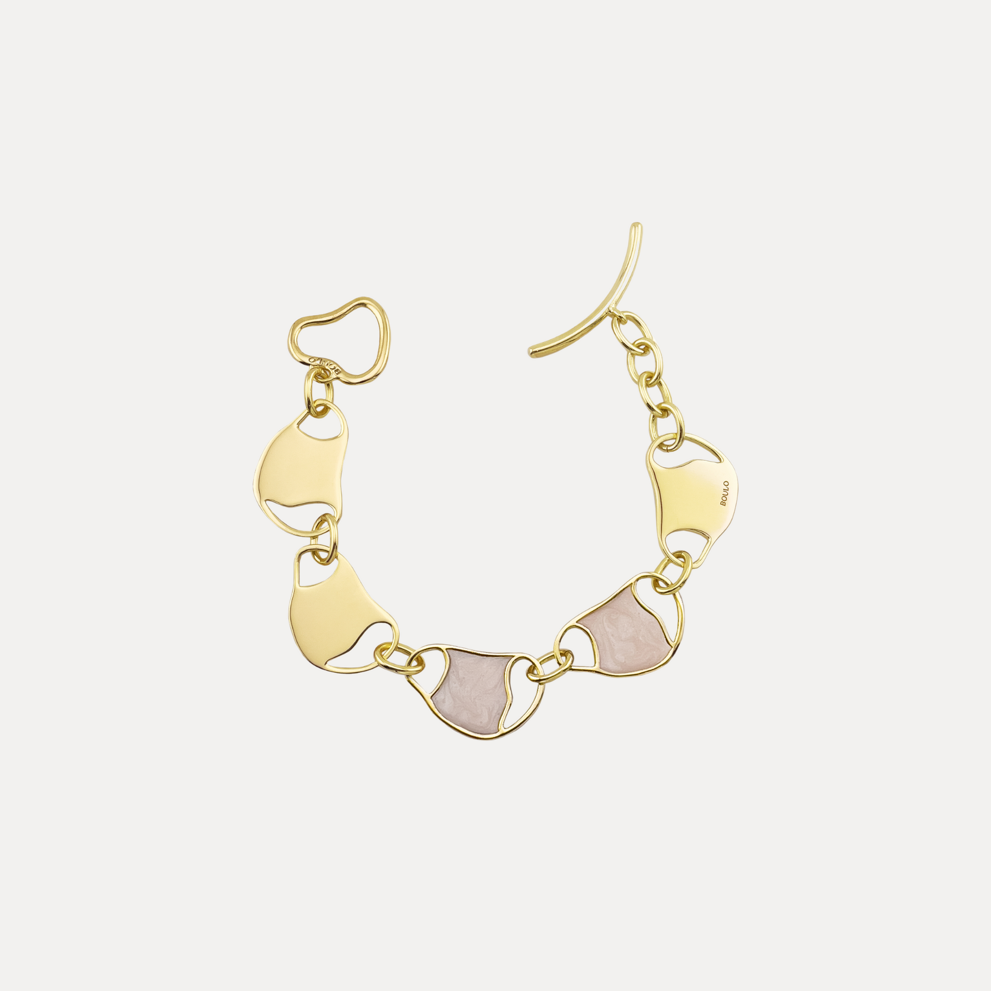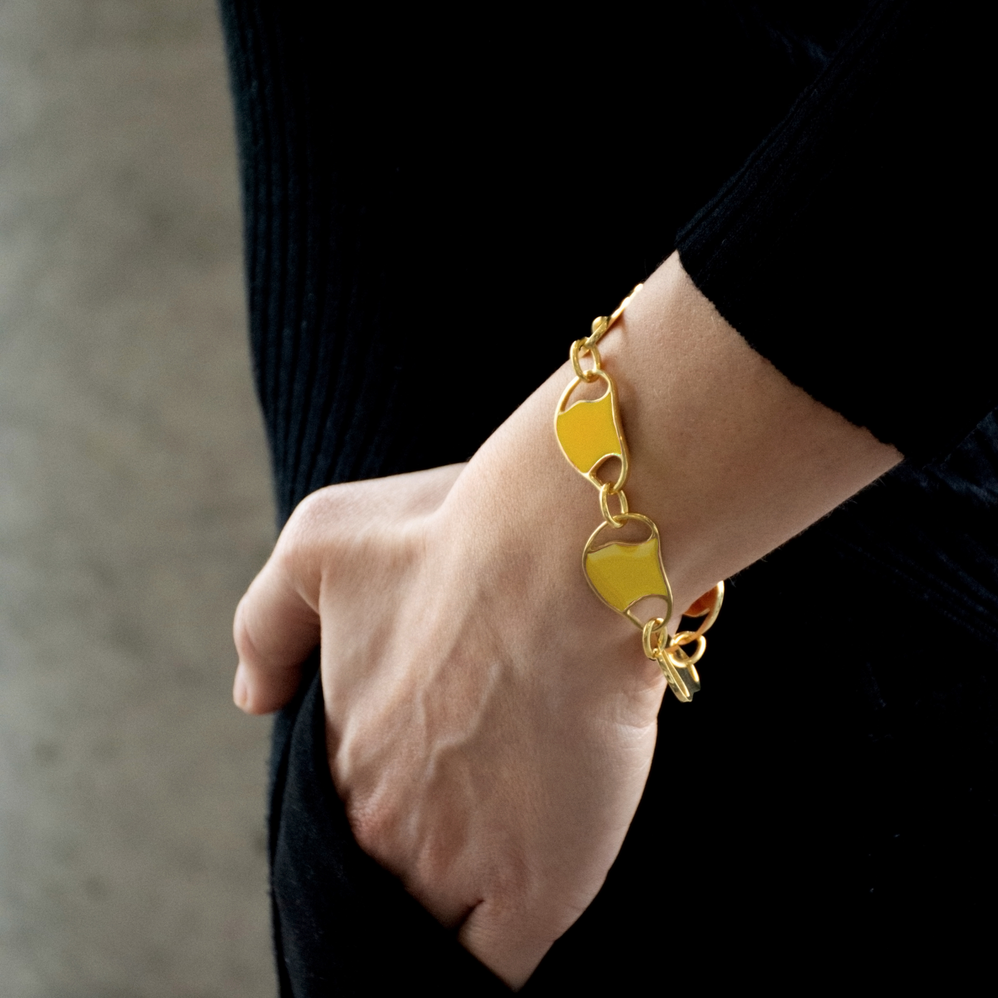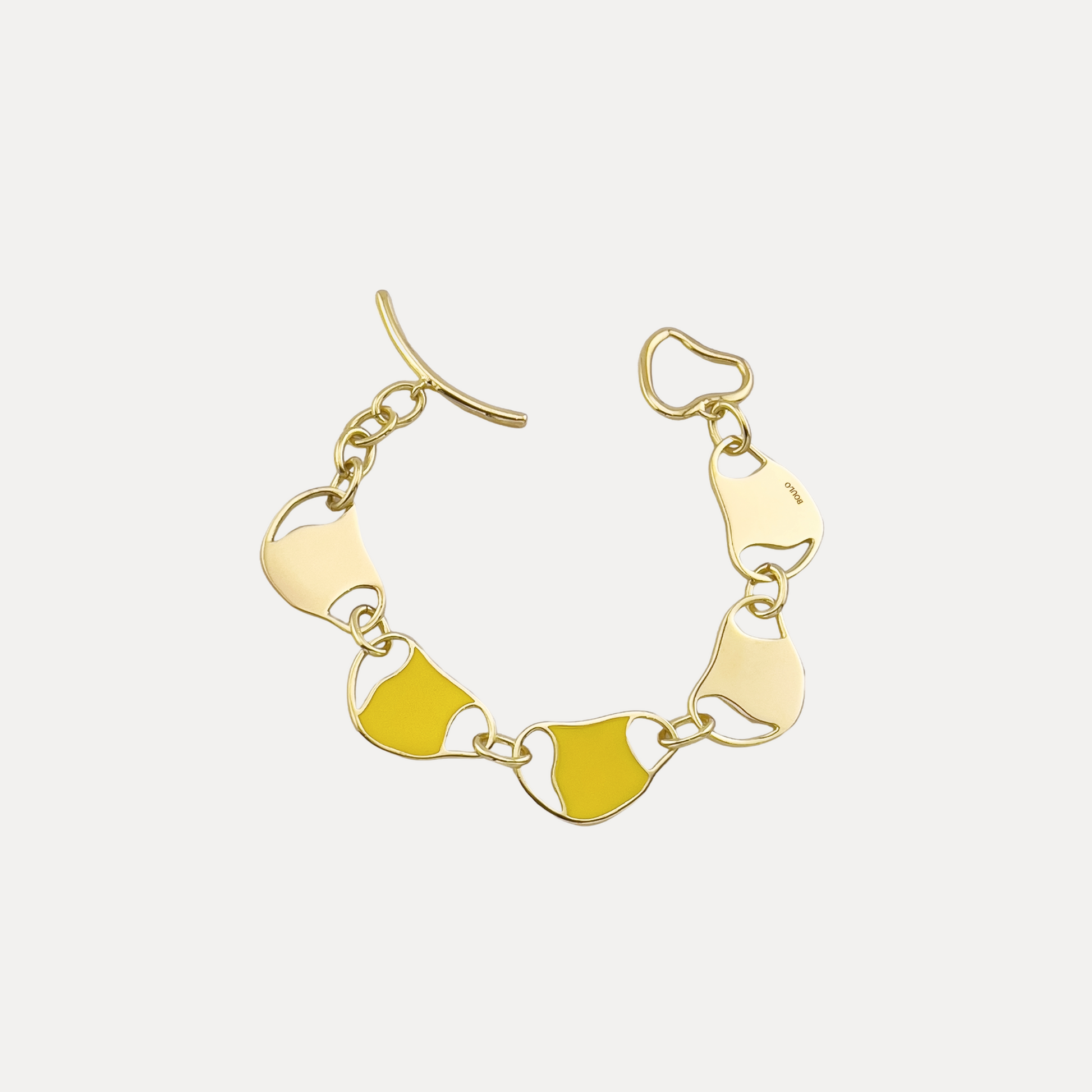 The Camille Duo Bracelet embodies elegance with its unique, playful design. Featuring vibrant yellow accents on one side and iridescent mother-of-pearl on the other, this bracelet blends functionality with chic appeal, making it ideal for everyday wear and special occasions alike. Its distinctive shape and the dynamic interplay of colors add depth and dimension, establishing it as a fun yet sophisticated choice for effortless style.
