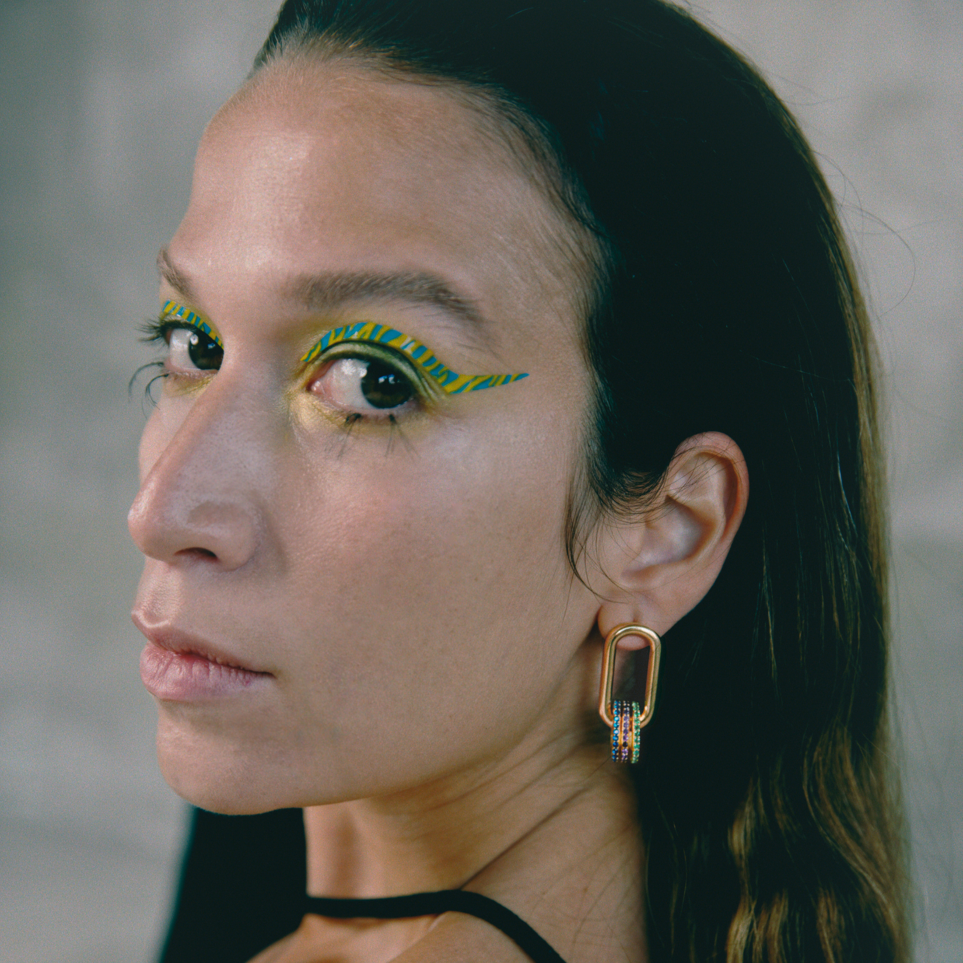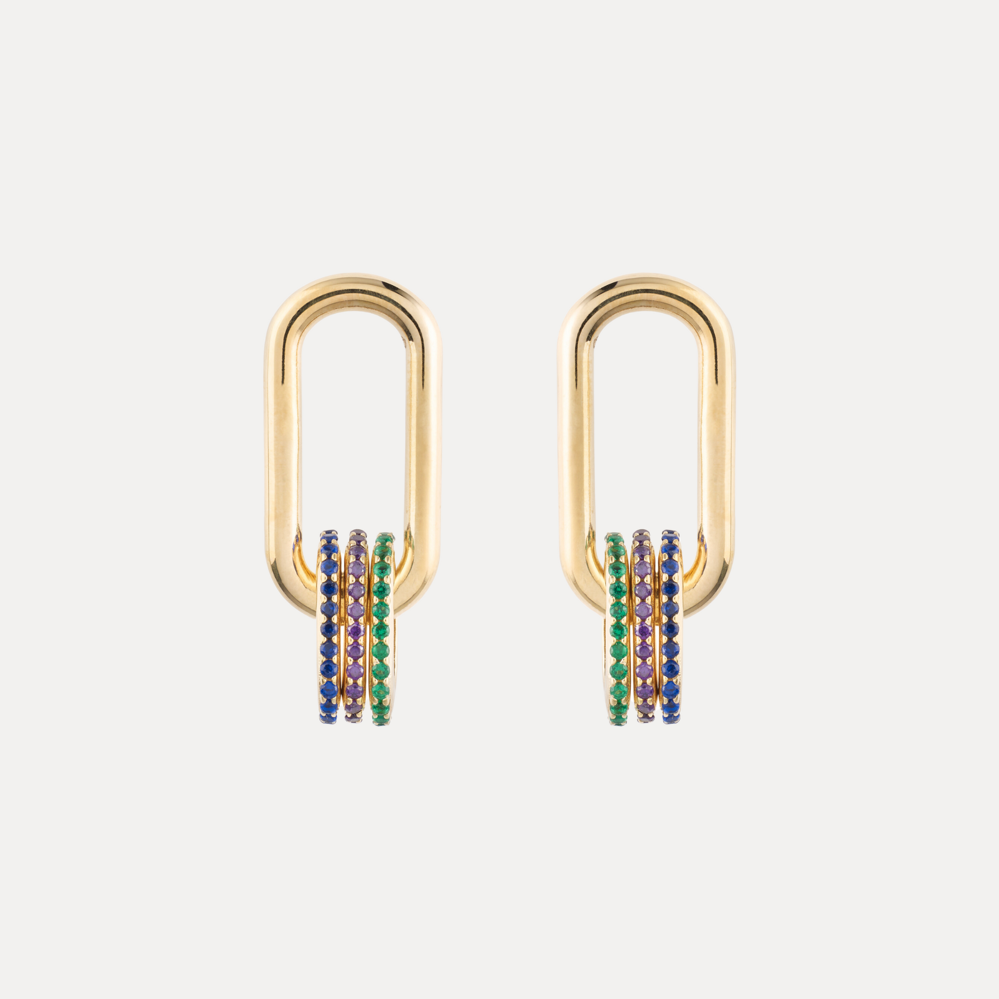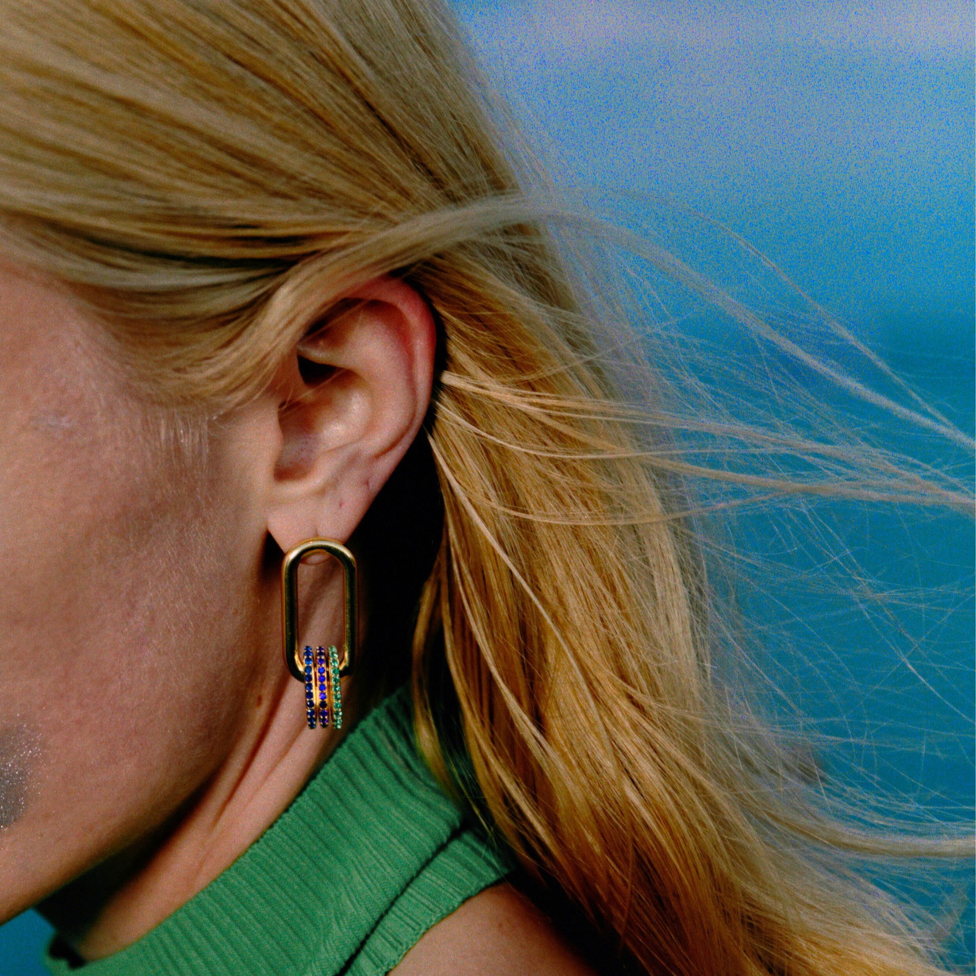 The Ellipse Party from BOULO captures the essence of celebration with its elegant, elliptical shape. Crafted with precision, this accessory is refined yet festive, ideal for both daytime and evening events. It is adorned with deep navy, rich green, and striking violet stones, injecting sophisticated vibrancy. The three ellipse hoops are ingeniously designed to be reversible, allowing for an all-gold look that offers versatile styling options.