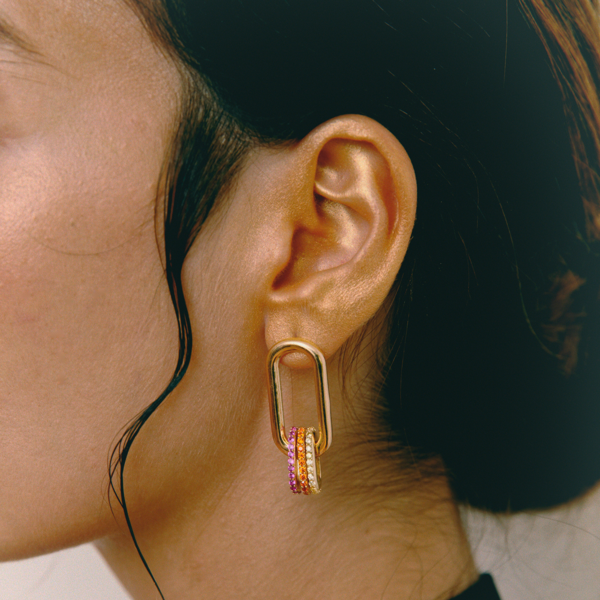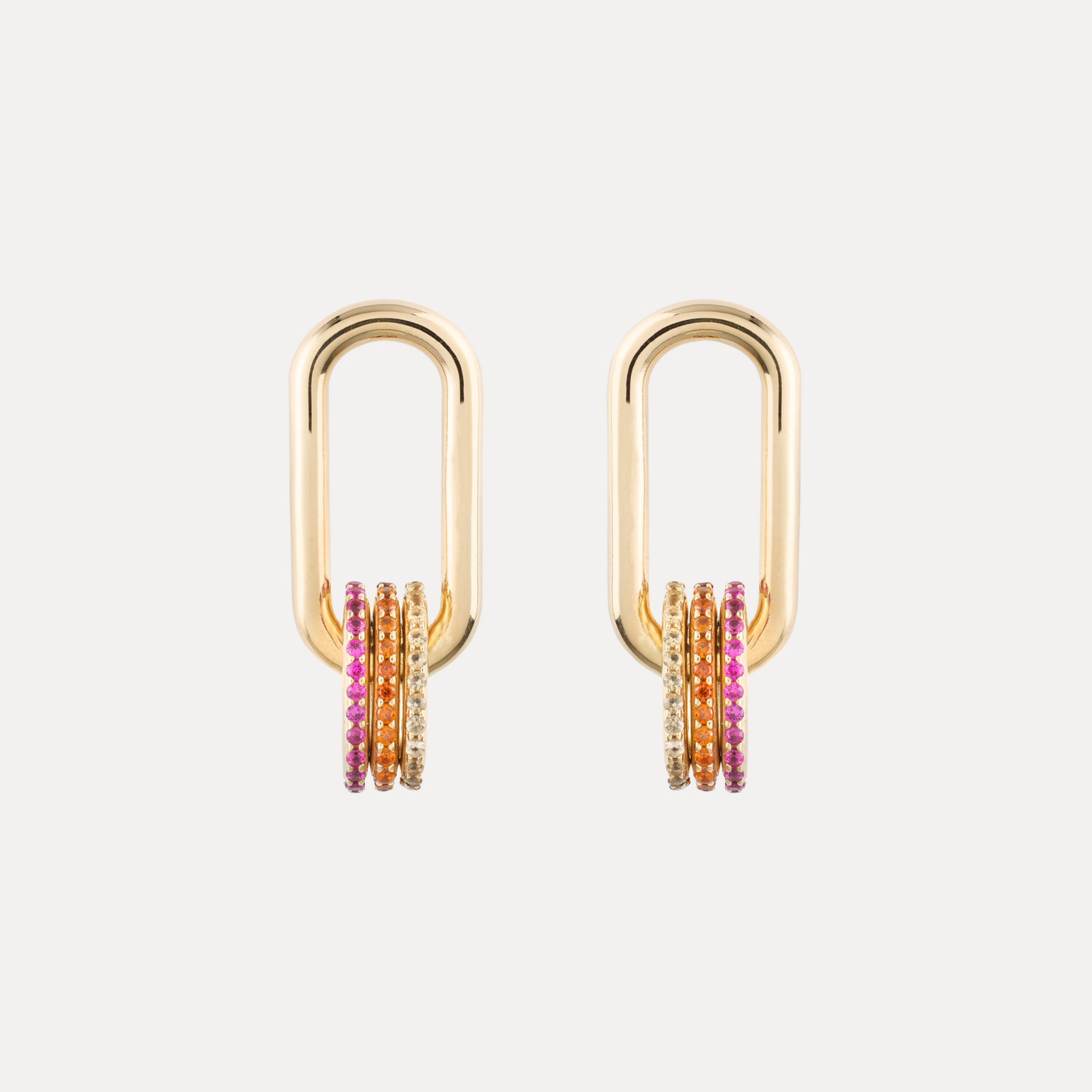 The Ellipse Party from BOULO captures the essence of celebration with its elegant, elliptical shape. Crafted with precision, this design offers a refined yet festive accessory, perfect for both daytime and evening events. Adorned with vibrant orange, pink, and yellow stones, it adds a burst of color and playful elegance. The three ellipse hoops are ingeniously designed to be reversible, allowing for an all-gold look that offers versatile styling options.