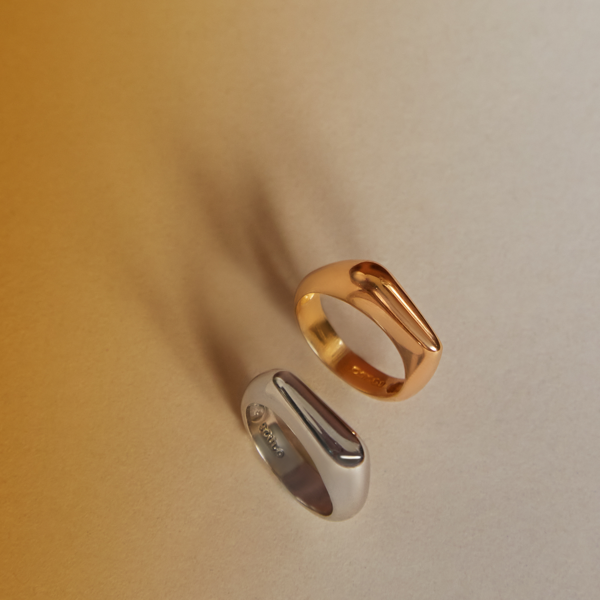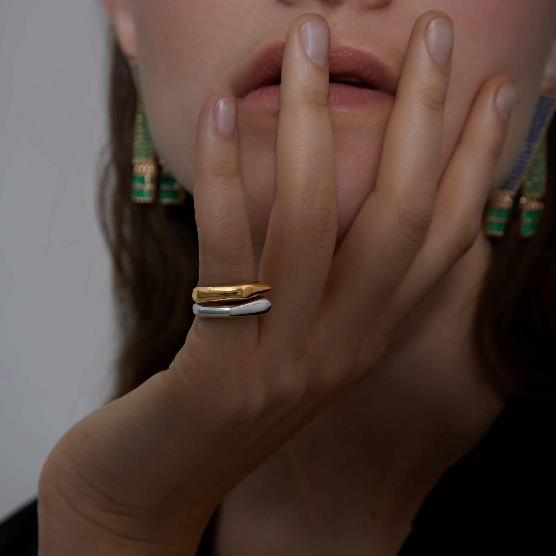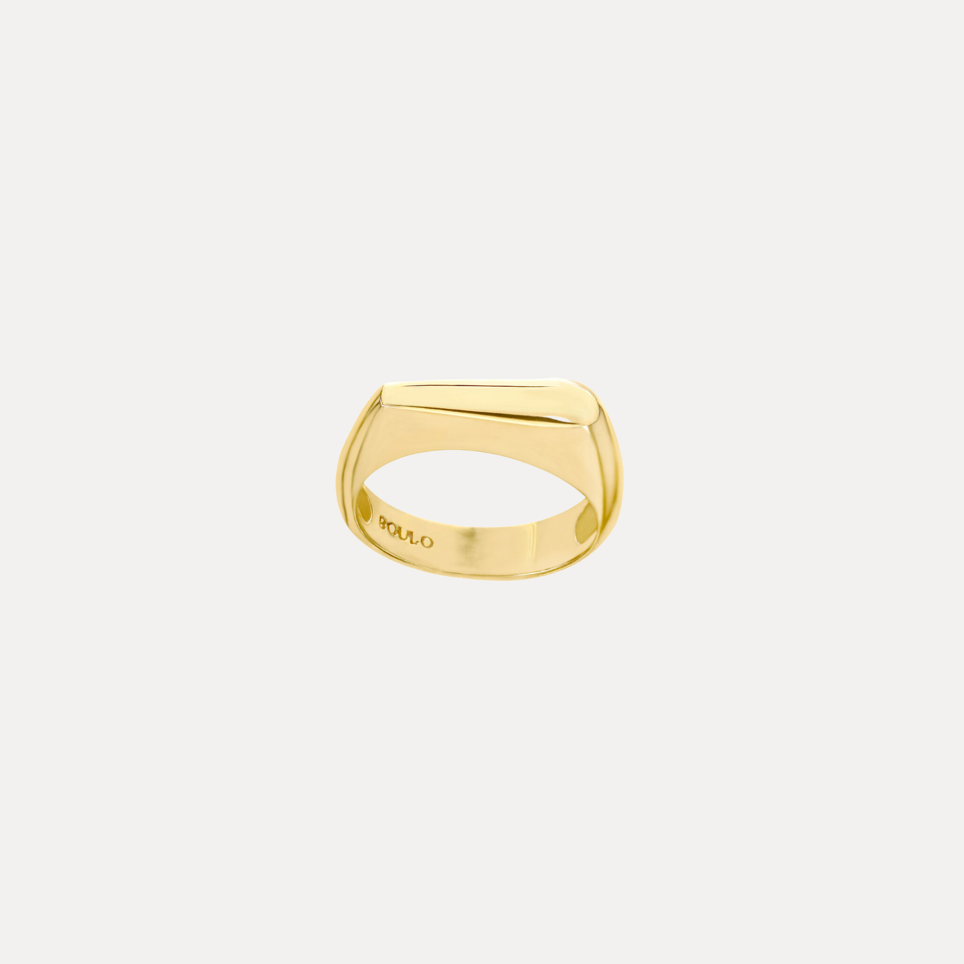 Exclusively crafted for the pinky, this gold colour ring invites you to layer with its silver counterpart for a strikingly unique ensemble. The ring showcases an asymmetrical design that elegantly flows from a full, rounded form on one side to a slender, finely tapered edge on the other.