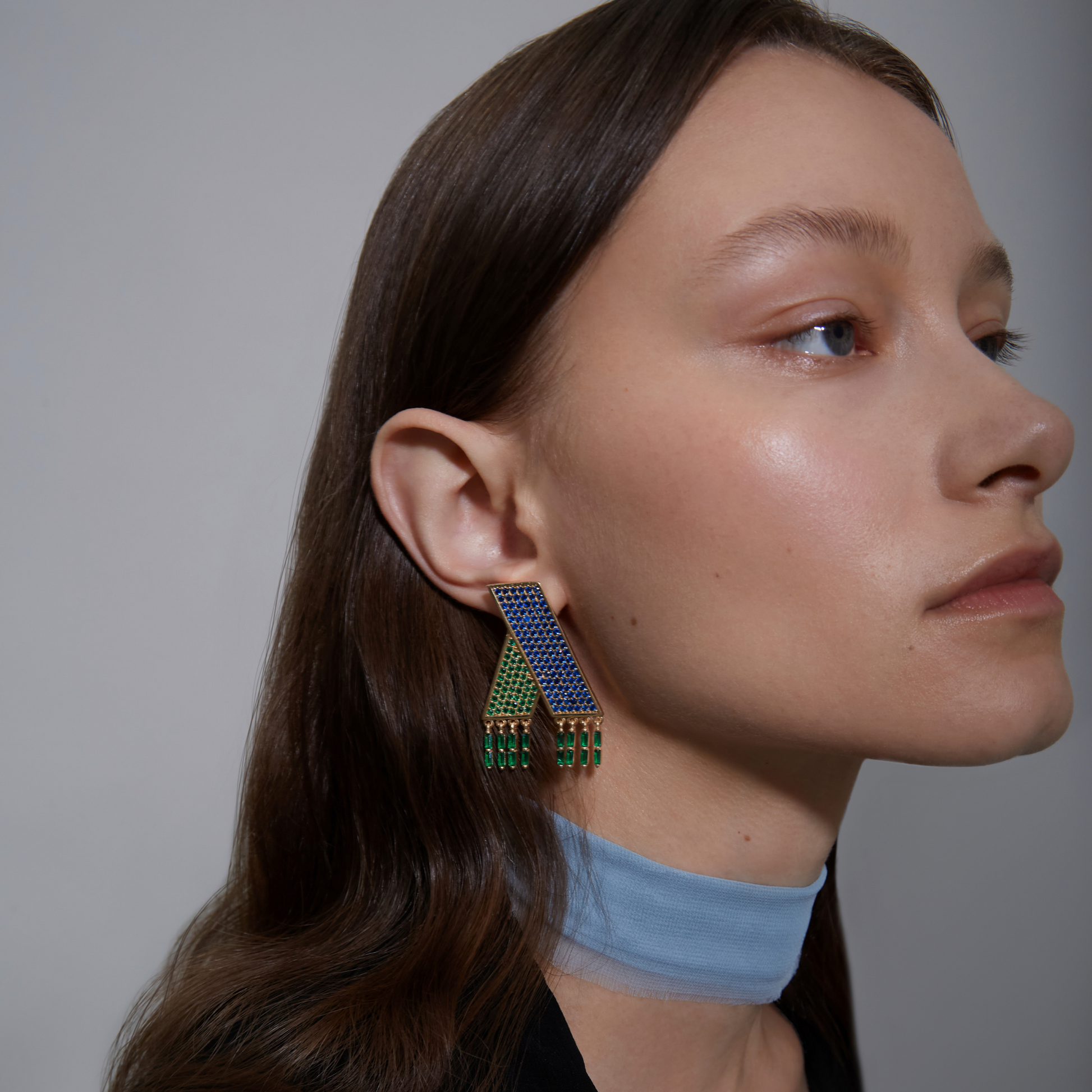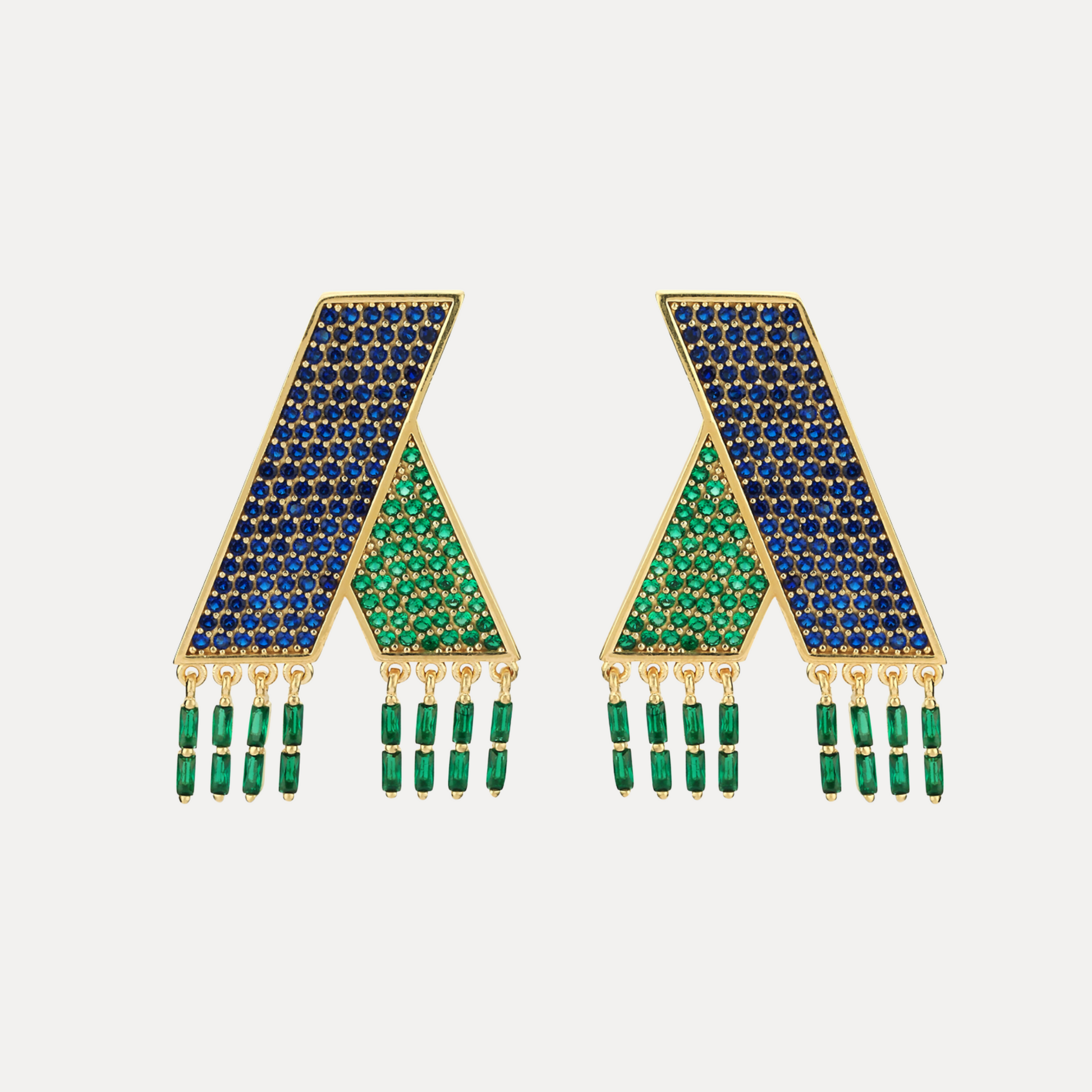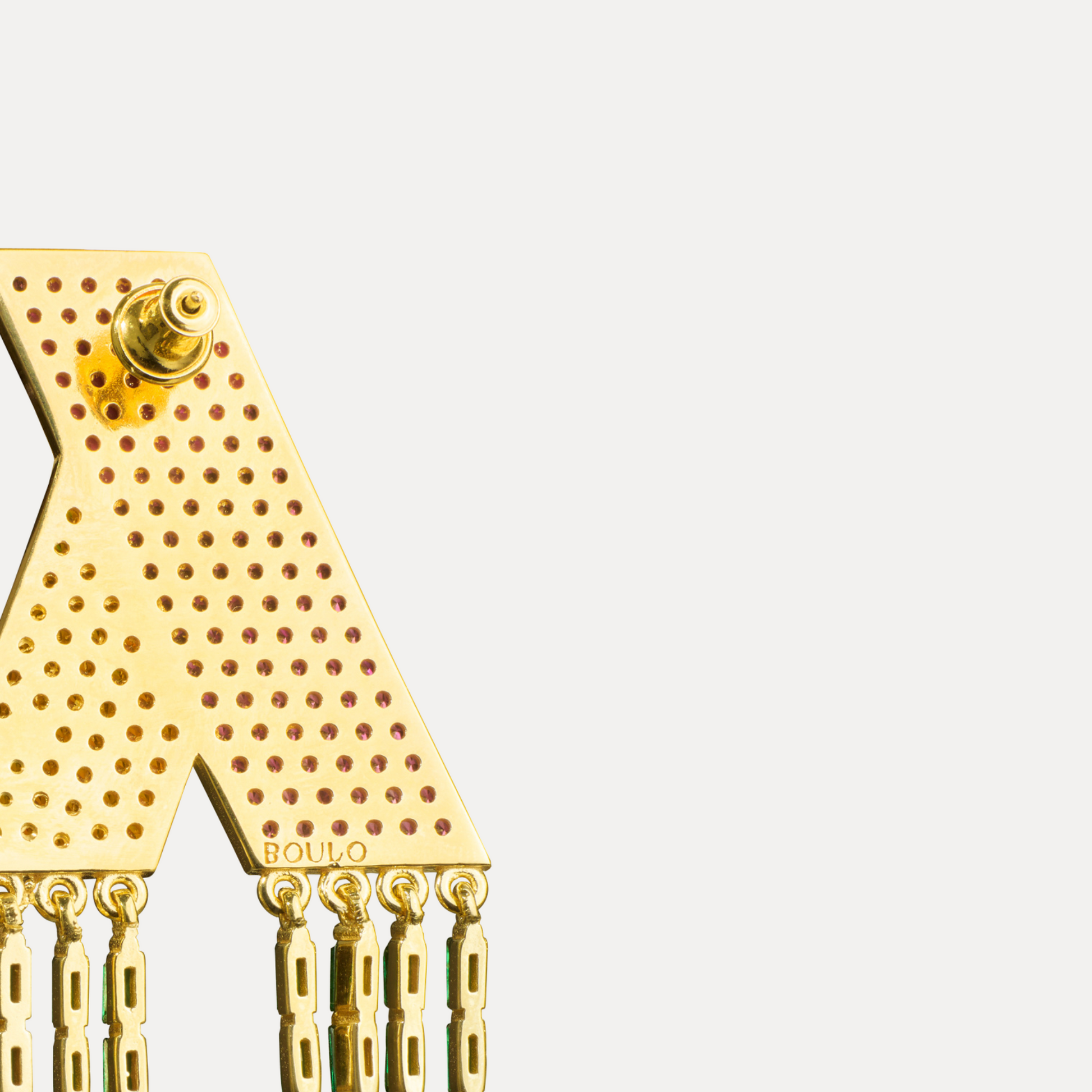 The signature piece, Lucid Dream, showcases a distinctive silhouette characterized by architectural contours and adorned with striking fringes that accentuate its unique form. This version is rendered in an alternative palette of rich, captivating colors, ensuring it remains a focal point and complements its bold design. The dynamic fringe detailing underscores its standout craftsmanship, making it a perfect choice for those looking to make a pronounced style statement.