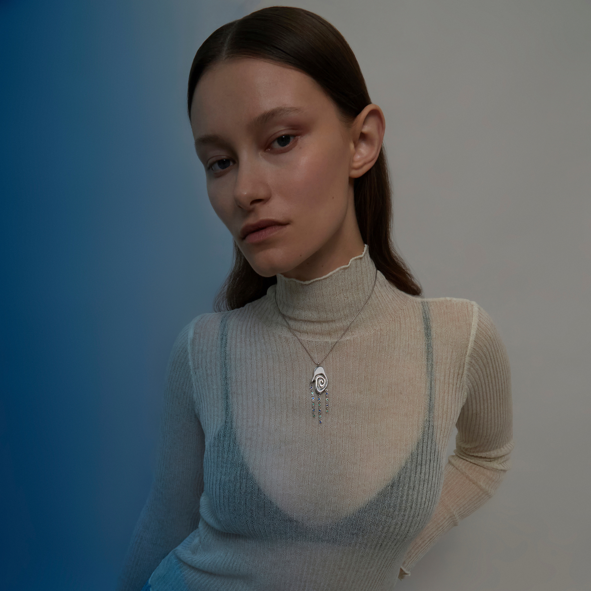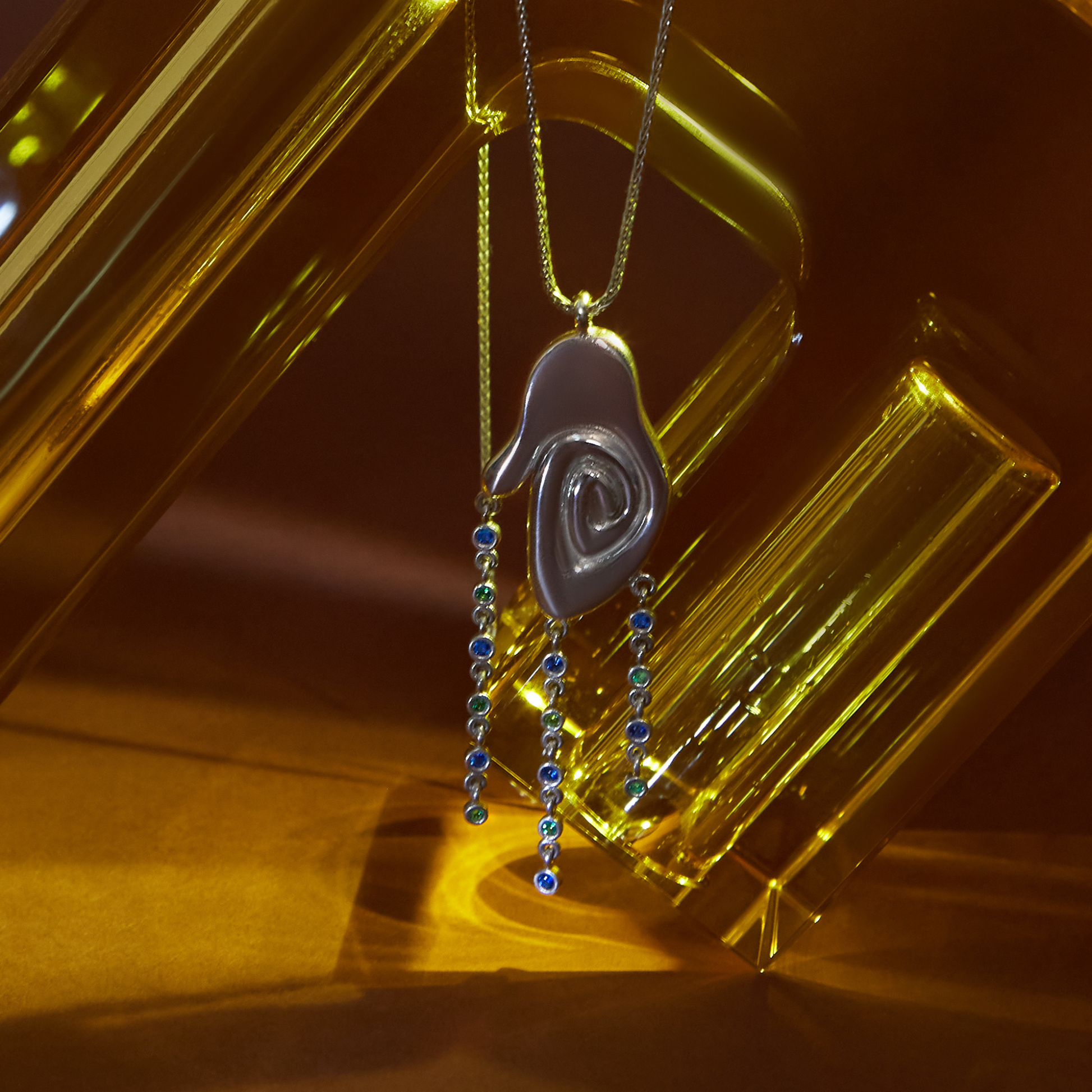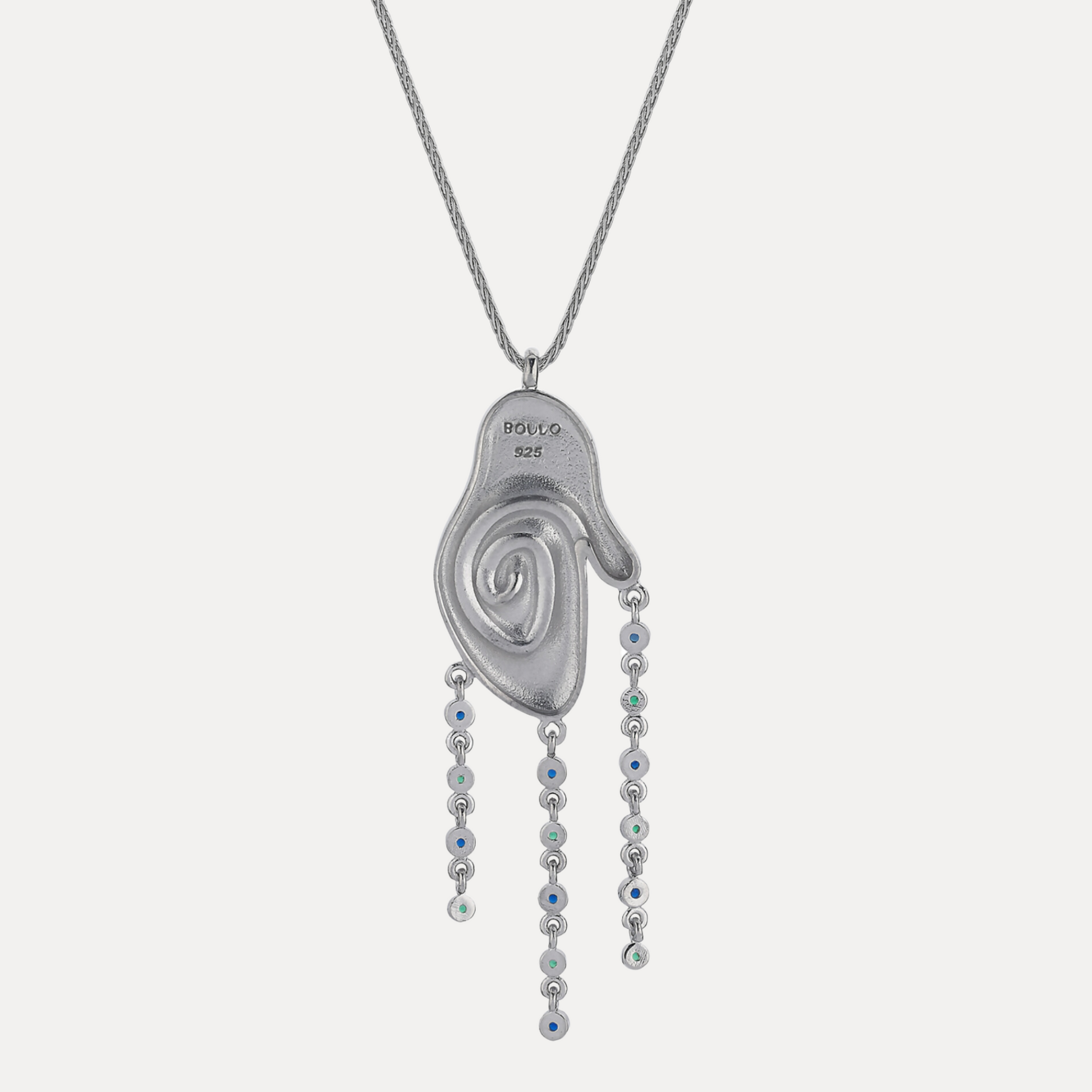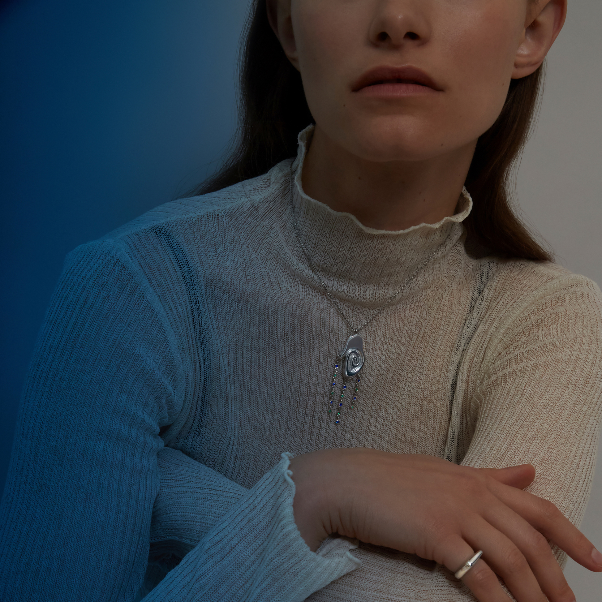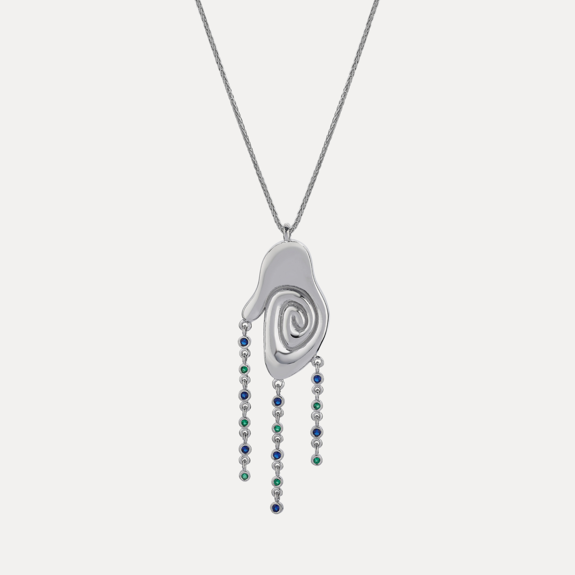 Originally a bespoke creation, the Mystic Order necklace features an elliptical shape that gracefully arcs to symbolise continuity and infinity, mirroring the endless possibilities of the universe. Adorned with delicate fringes with navy and emerald stones, these elements add a dynamic texture, enhancing the design with a sense of movement and fluidity. This design not only captures the eye but also invites a deeper reflection on the interconnectedness of life's events, illustrating how each piece of the cosmos, and our lives, fits into a larger, beautiful pattern.
