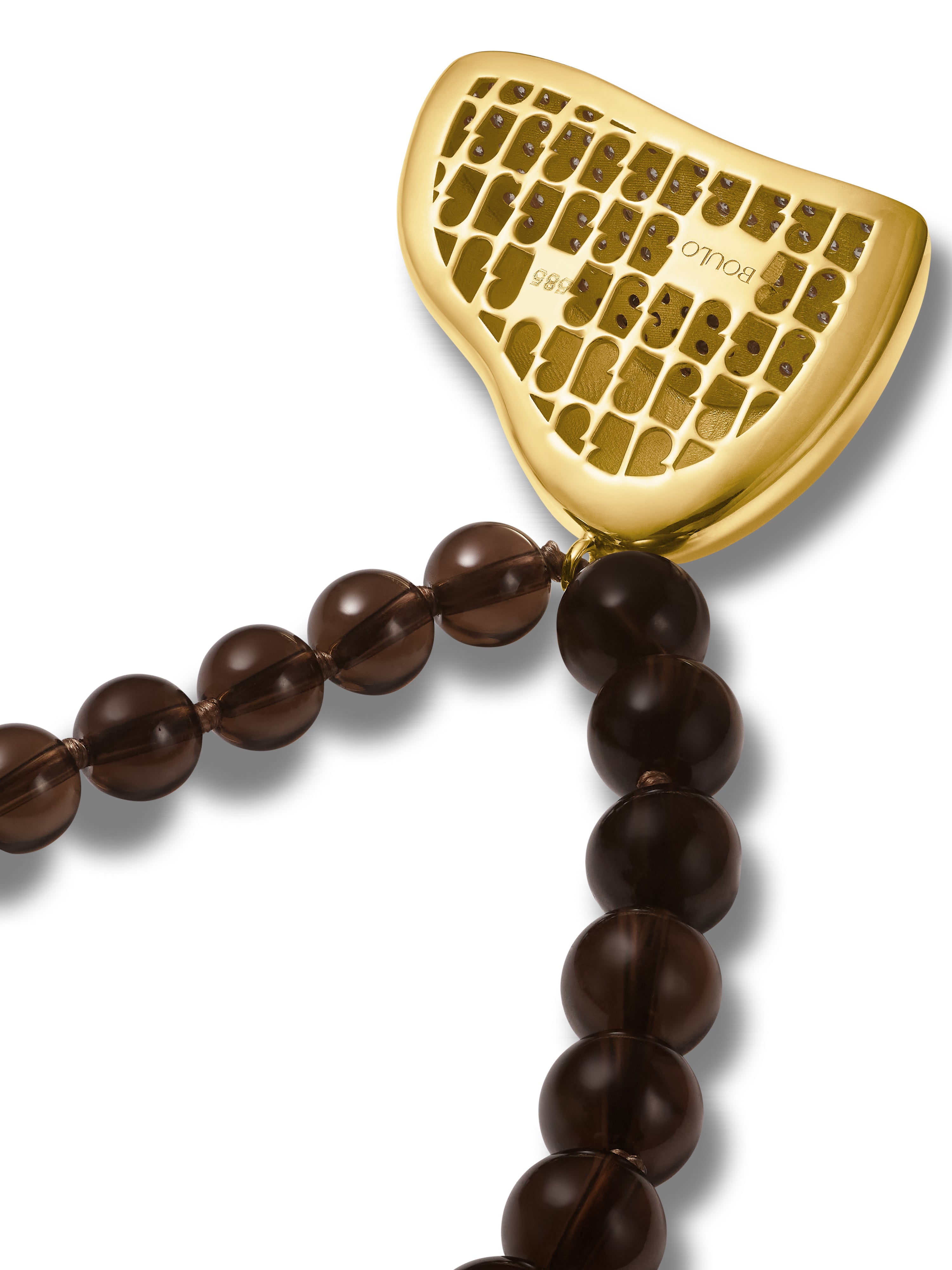 Seed 117 necklace begins with BOULO's signature form, held only at its upper half where it meets smoky quartz. From there, the line extends, drawn into volume and transforming the piece into three-dimensional form. The closure sits at a precise 45-degree angle and is set with 117 diamonds, adding light as a subtle discovery without interruption. On the reverse BOULO's monogram appears for the first time, carved as negative space blocks - subtle, recessed, and intentional, present by absence. Designed to be felt from every angle, Seed 117 necklace continues where most jewellery pieces end.