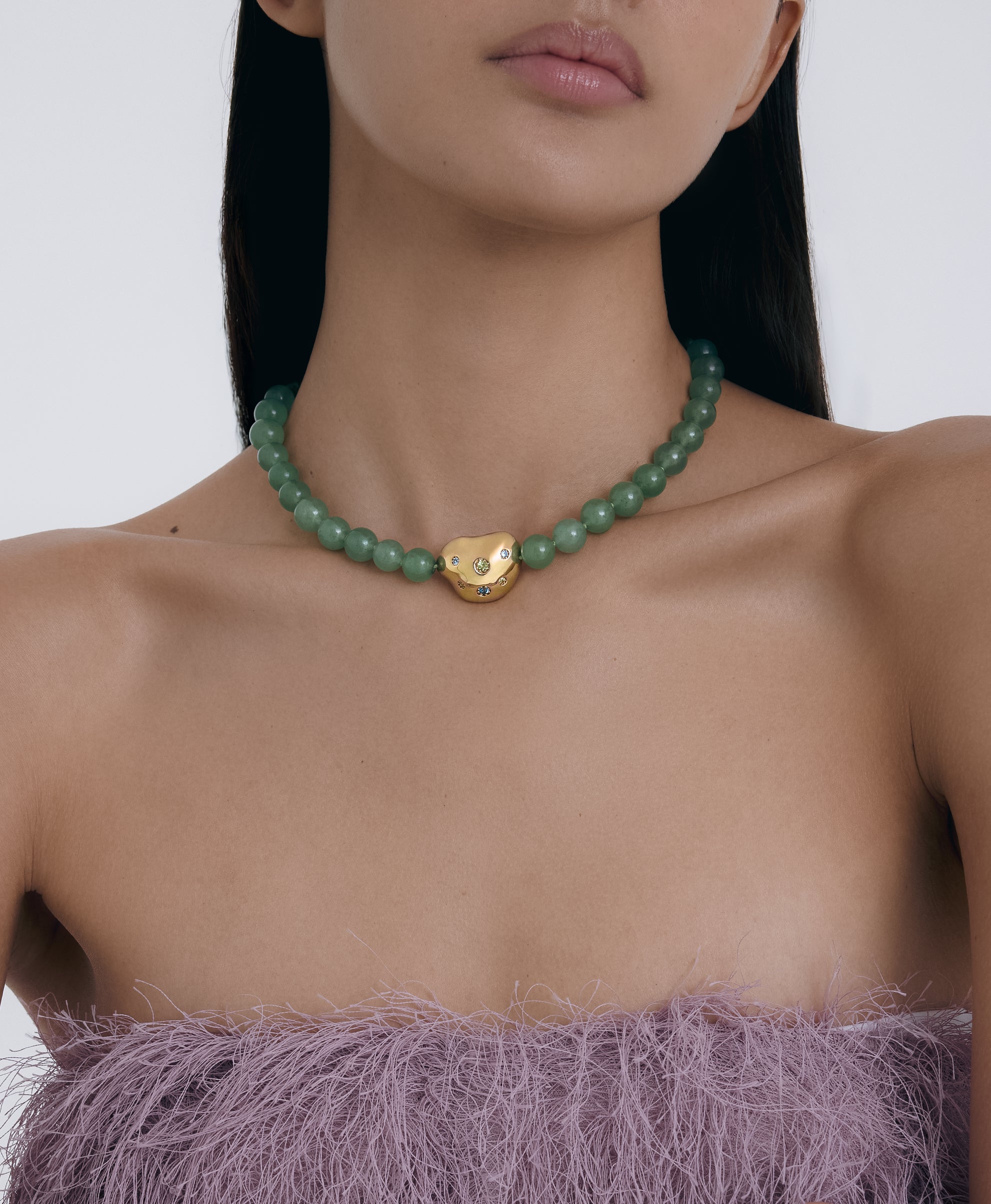 The Seed Aventurine necklace sits at the collarbone, designed to feel natural with any outfit, from day to evening. Soft, smooth green Aventurine beads bring a subtle sense of playfulness and colourful charm, punctuated by BOULO's signature organic gold accent - set with delicate touches of colour that catch the eye without demanding attention. Finished with BOULO original t-lock closure, the necklaces balances function with vibrant, playful design, allowing the piece remain fluid and easy to wear. A colourful fine jewellery essential that feels light, expressive, and quietly distinctive.