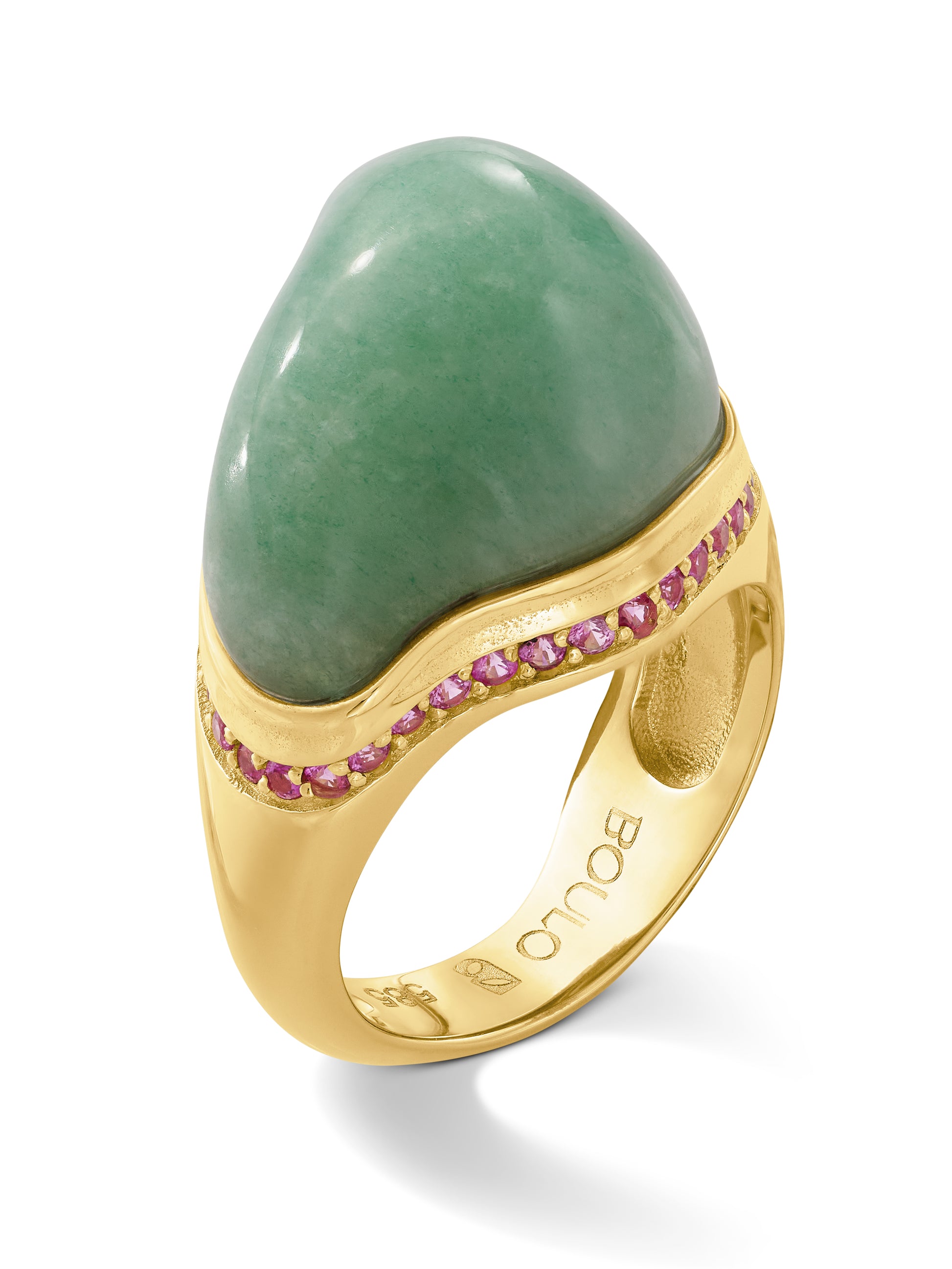 A bold interpretation of BOULO’s signature design, this ring features a hand-carved Aventurine as its focal point. Subtly framed by delicate stones, the composition enhances the depth and smooth texture of the carved surface without overpowering it. Designed for those drawn to sculptural rings, Shapeless stone offers volume with everyday comfort. The result is a distinctive piece of colourful fine jewellery - rooted in craftsmanship, rich in character, and defined by an effortless sense of individuality.