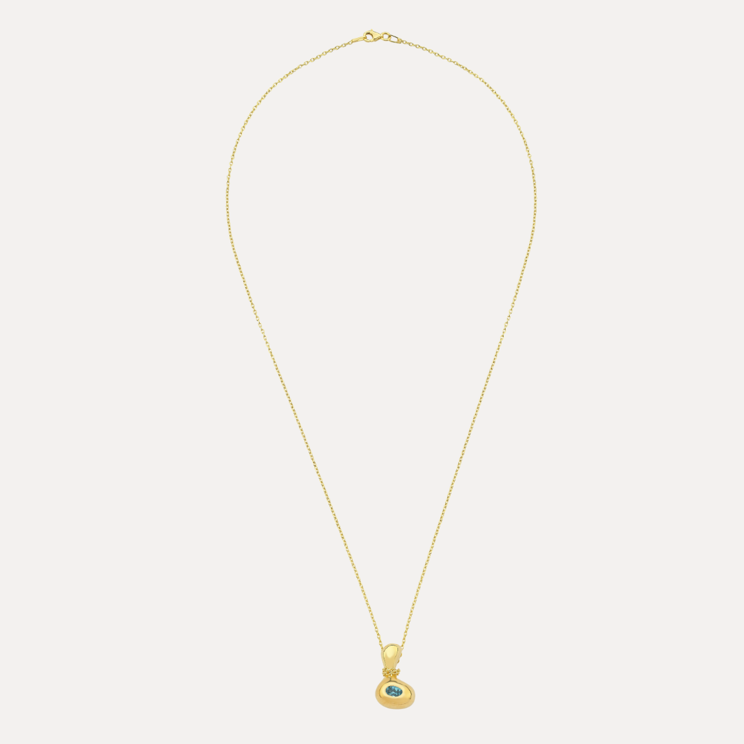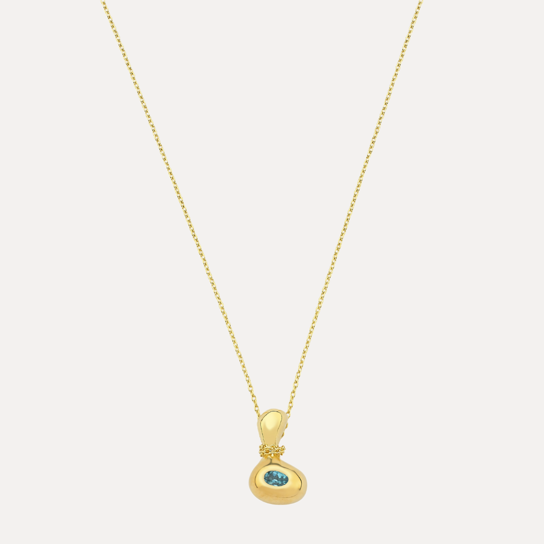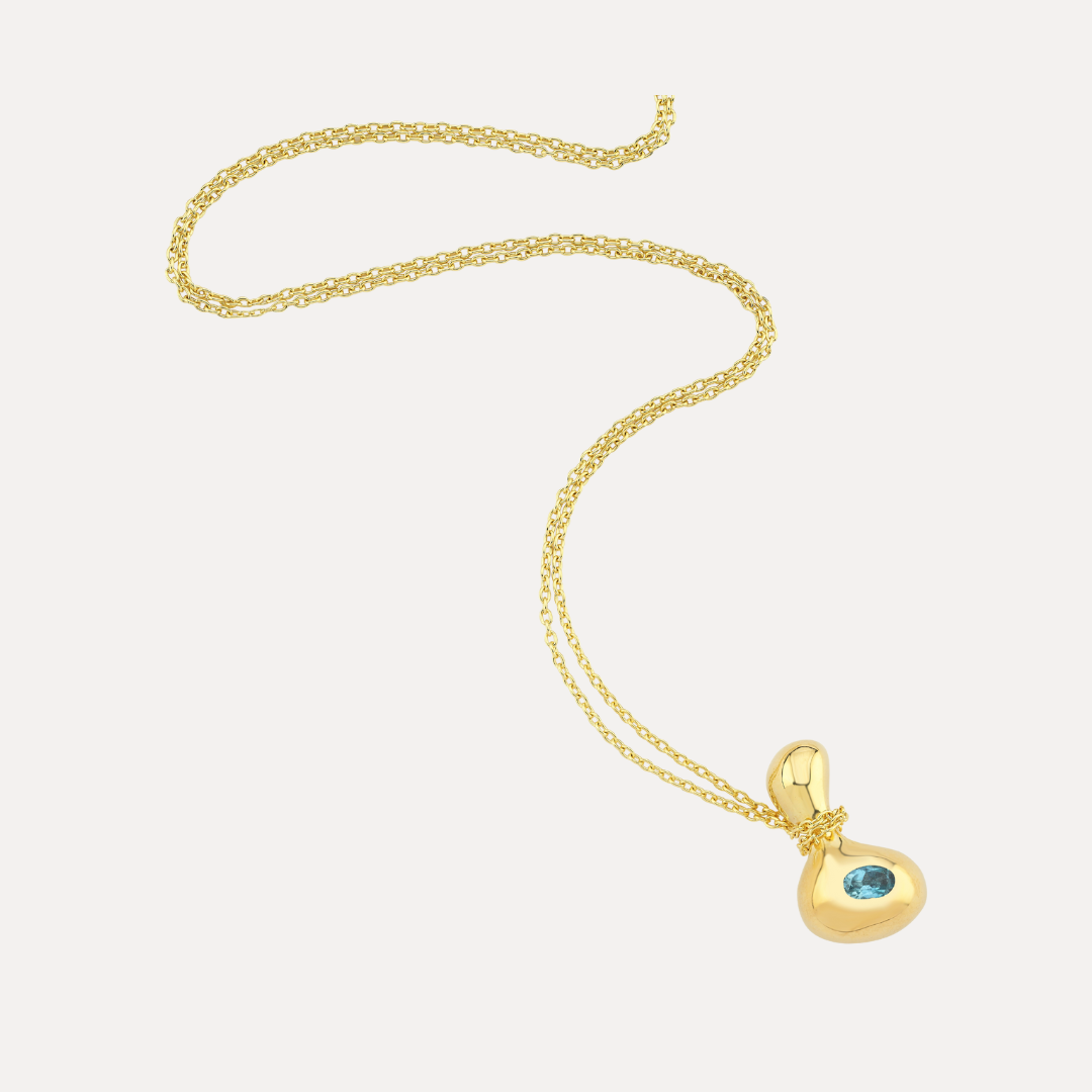 Suspended on a chain that wraps and holds, locked in motion. A sculptural play on form and fluidity, the pendant takes the shape of a bowling pin, cast in silver and micron-plated in 18-karat gold. The chain wraps around the neck of the pin and is fixed in place, seamlessly integrated into the design. A Swiss topaz sits at its base, bezel-set for a seamless finish, its cool clarity contrasting the metal’s quiet warmth.