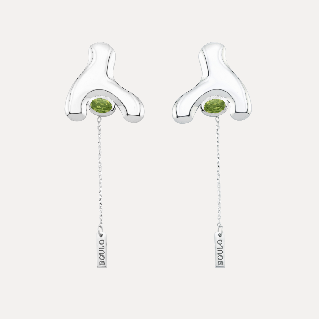 These sharp Wishbone Earrings boast a fluid, sculptural curve inspired by the wishbone shape. Set with vivid peridot gemstones, they create a bold contrast against the sleek, high-polish silver. A delicate chain drop, finished with a BOULO tag, adds playful movement—striking yet effortless.